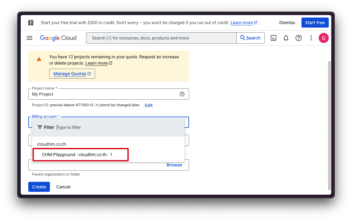 1.4.5 ส่วนของ Billing account เลือกให้ตรงกับ Email ที่ทาง Cloud HM ส่งให้ > คลิก CREATE เพื่อสร้าง Project
